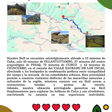 Hay una distancia de 60 km entre el aeropuerto Internacional de Cuzco y la Hotel&Country House Valle Sagrado de los Incas. - ❓